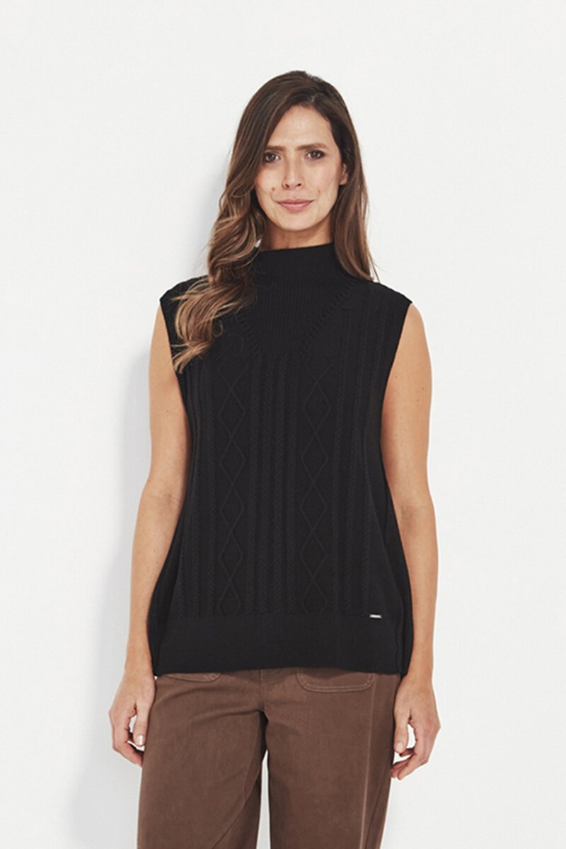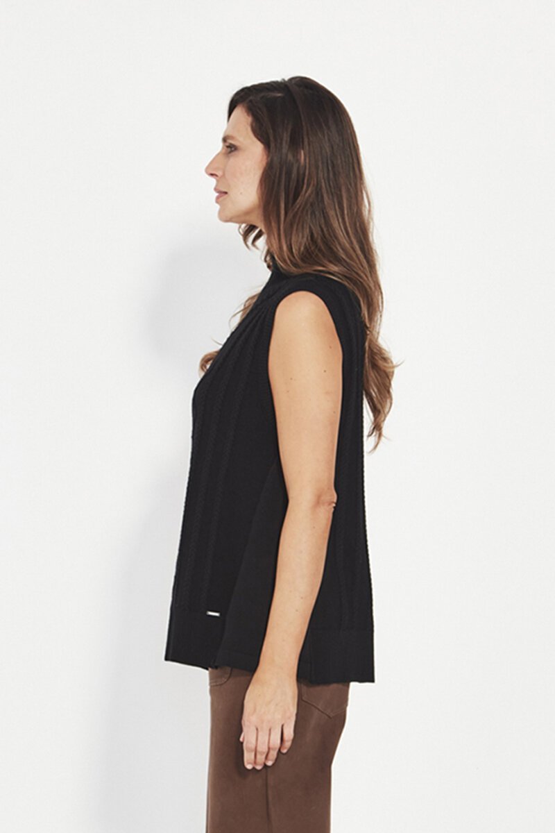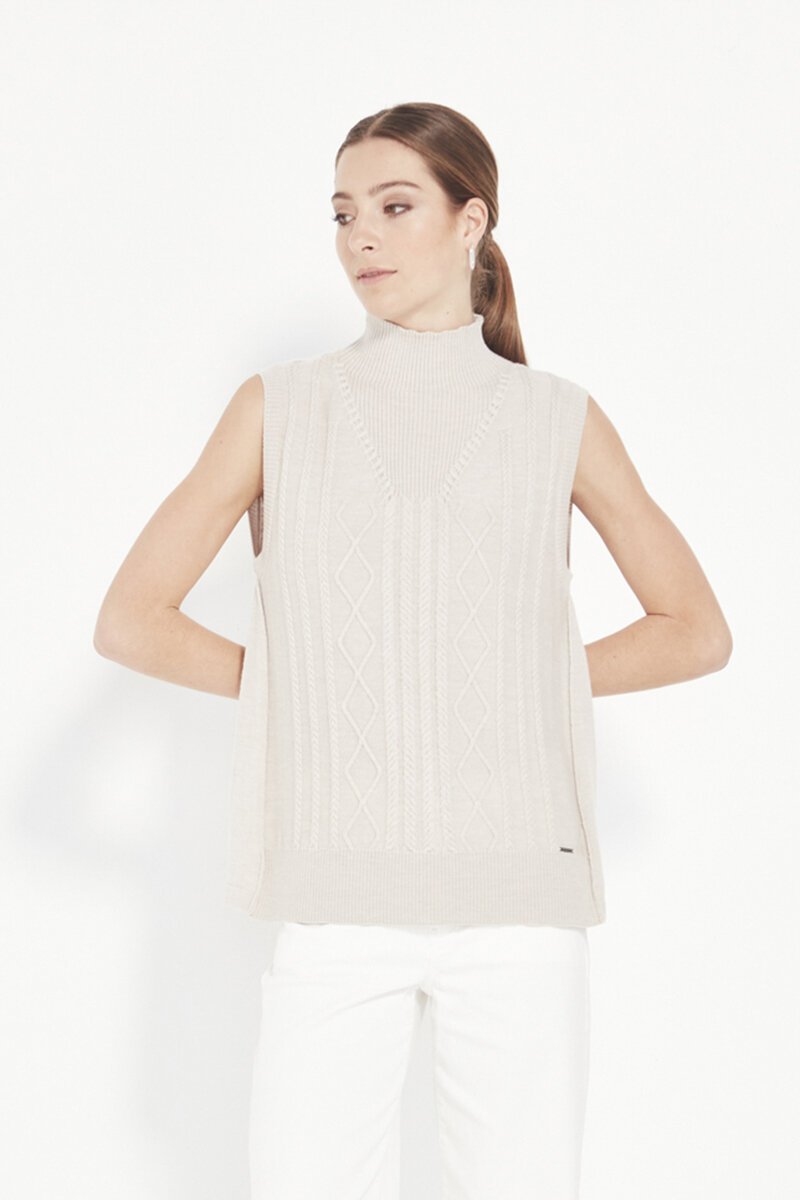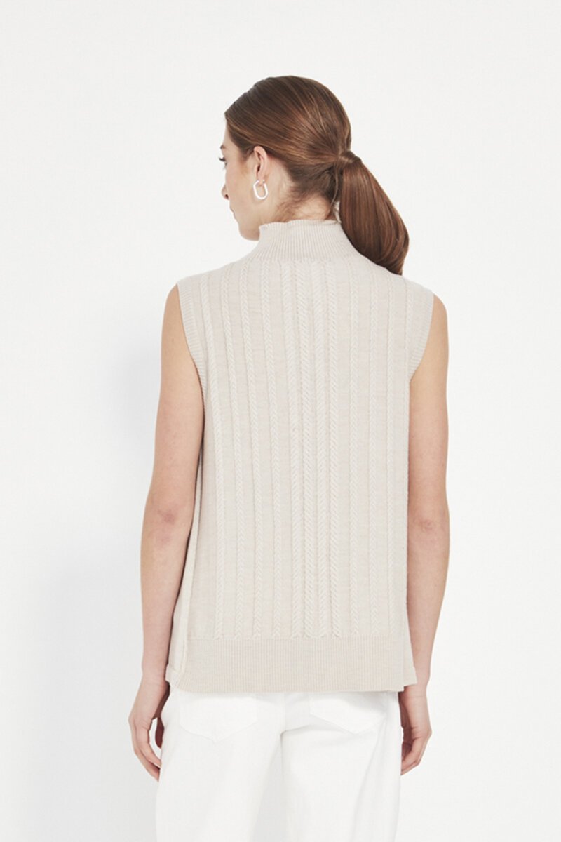 The Cherish Vest is a timeless knit layer with refined texture. Cable detailing and a high neckline create an elevated piece that works effortlessly across seasons and outfits.