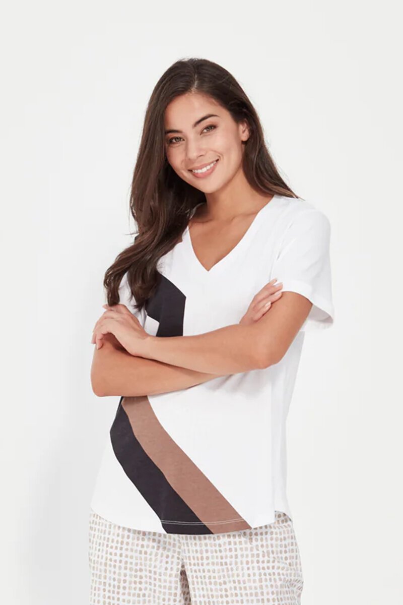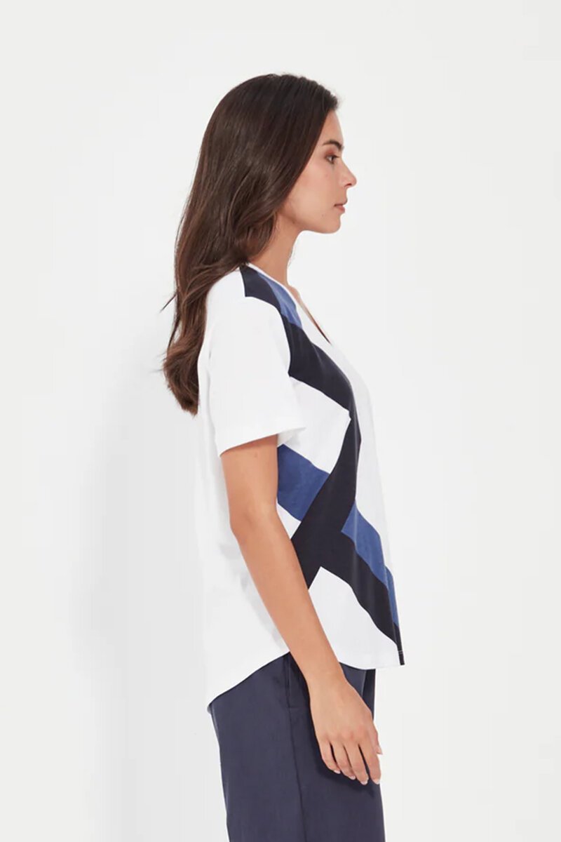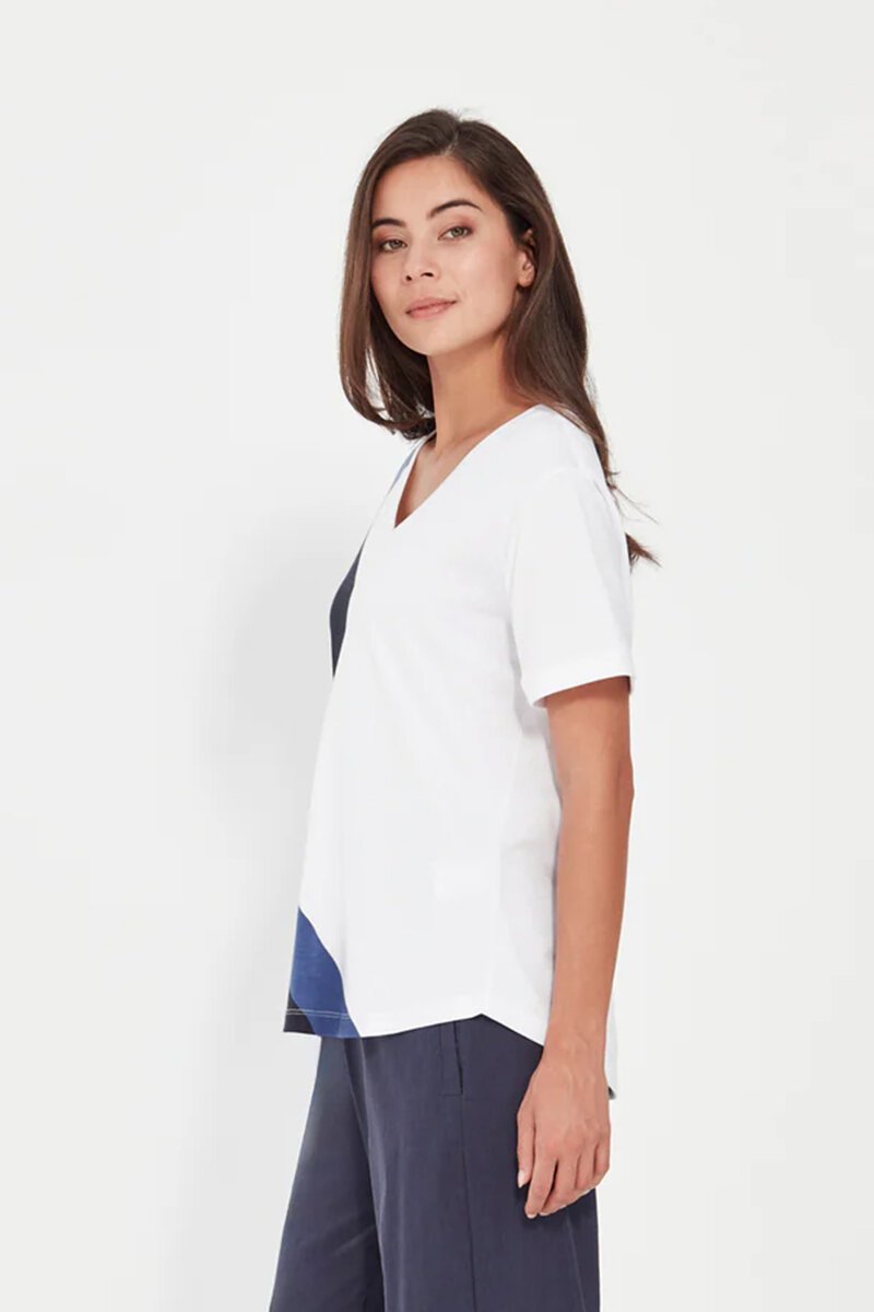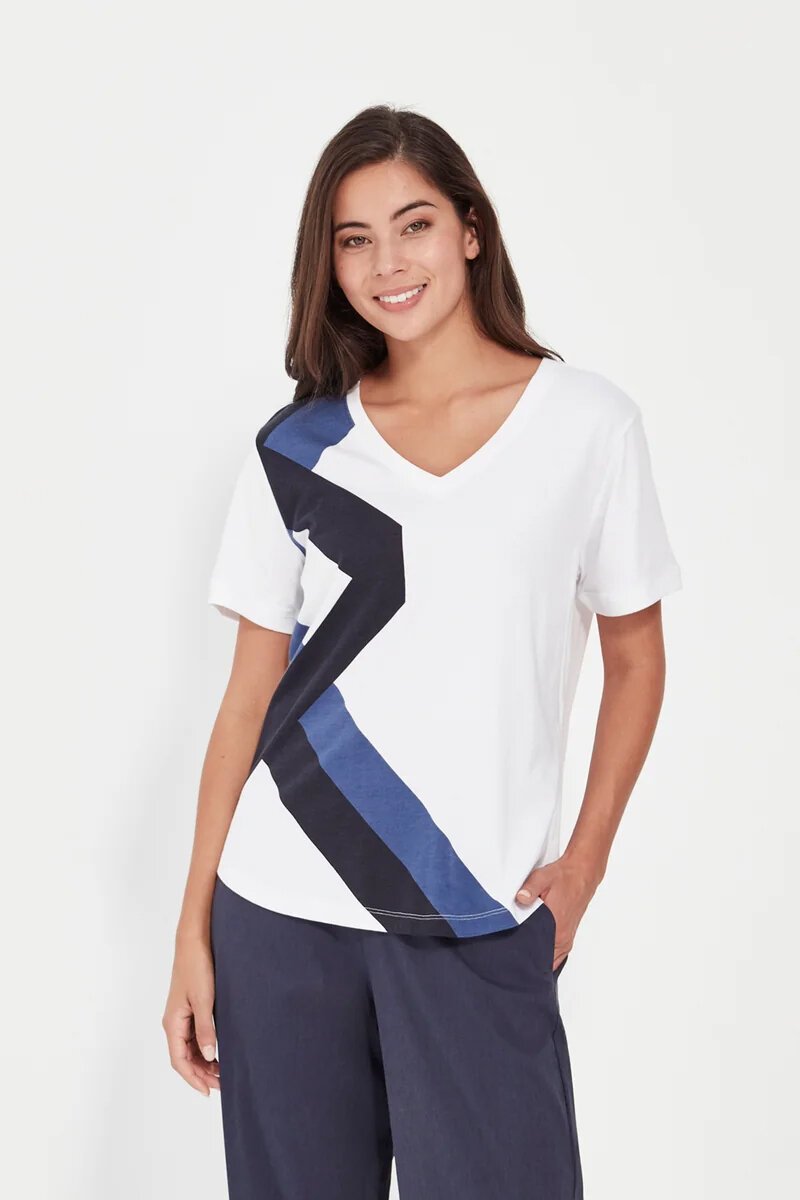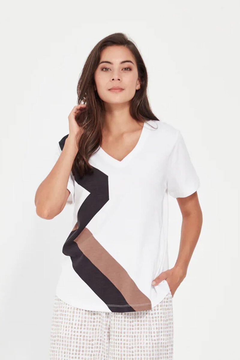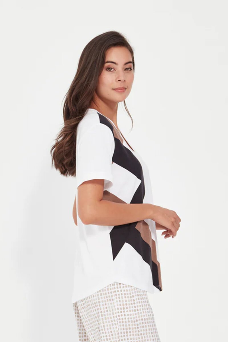 The Coil Top is made from soft cotton-modal jersey with a flattering V-neck and short sleeves. A bold geo print down one side adds a modern twist to this easy, everyday essential.
