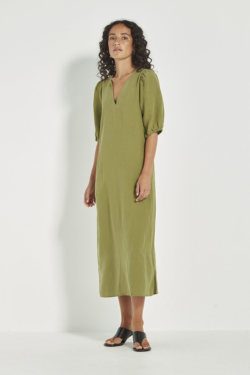 The Verge Connie Dress — relaxed elegance made easy. Crafted from soft, breathable linen with a flattering V-neck and gently puffed sleeves, this midi moves beautifully with you. Pair it with slides by day or dress it up for dinner with statement earrings.