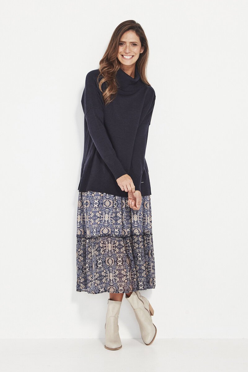 The Gaby Sweater is a modern knit with soft structure and relaxed drape. A refined cowl neckline and subtle shaping details create an easy, elevated everyday piece.
