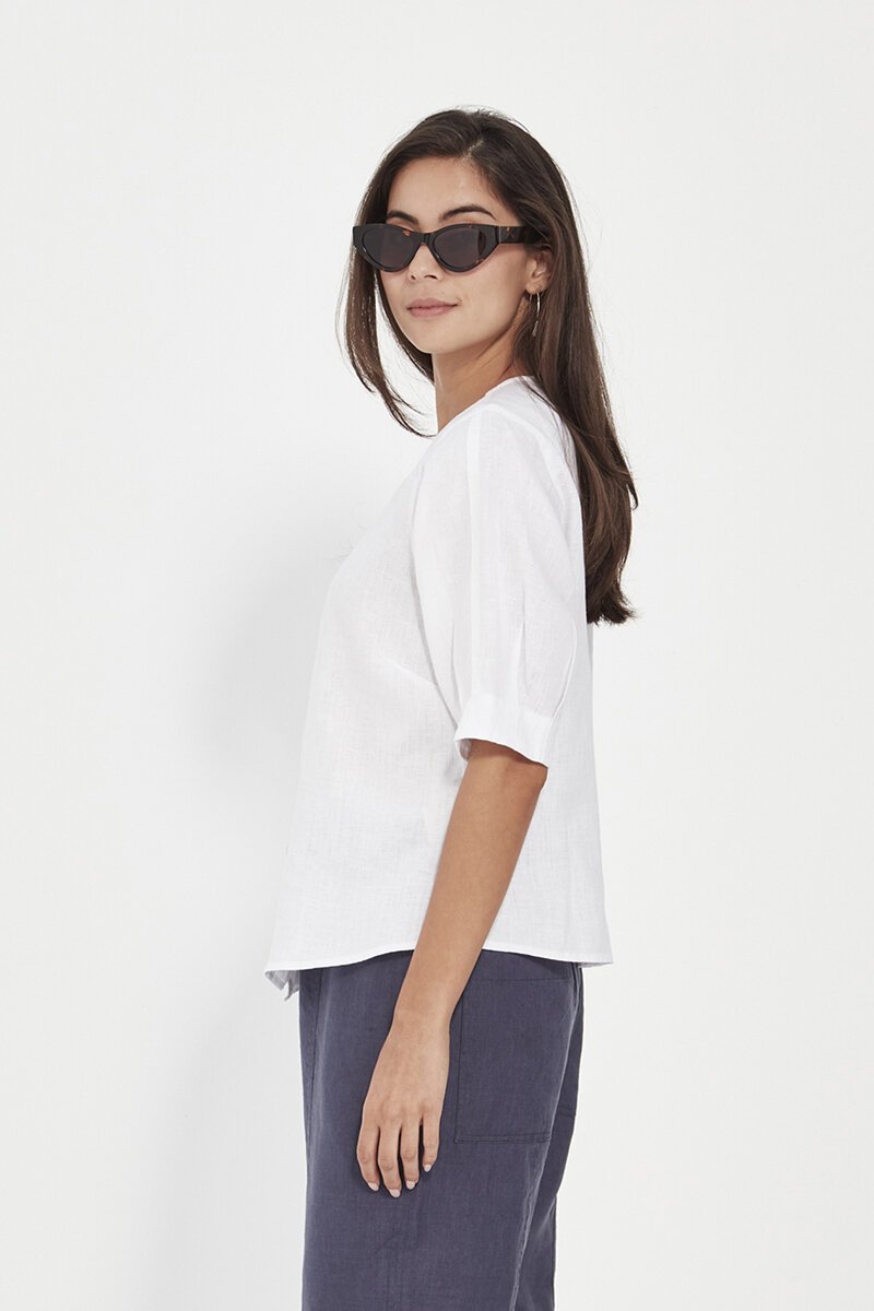 The Verge Trinity Top — understated and effortlessly elegant. Crafted in breathable linen with a flattering V-neck and relaxed silhouette, it’s the kind of piece that makes warm-weather dressing feel easy. Pair it with linen pants or denim for everyday polish.