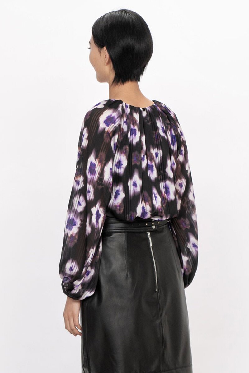 Cut in a striped satin chiffon and printed with our custom Ultraviolet floral print, this flattering style will be on high rotation. Cut with romantic blouson sleeves and a gathered v-neckline, this top falls to a relaxed fit. Wear with a leather skirt or layer under a suit for effortless weekday dressing.