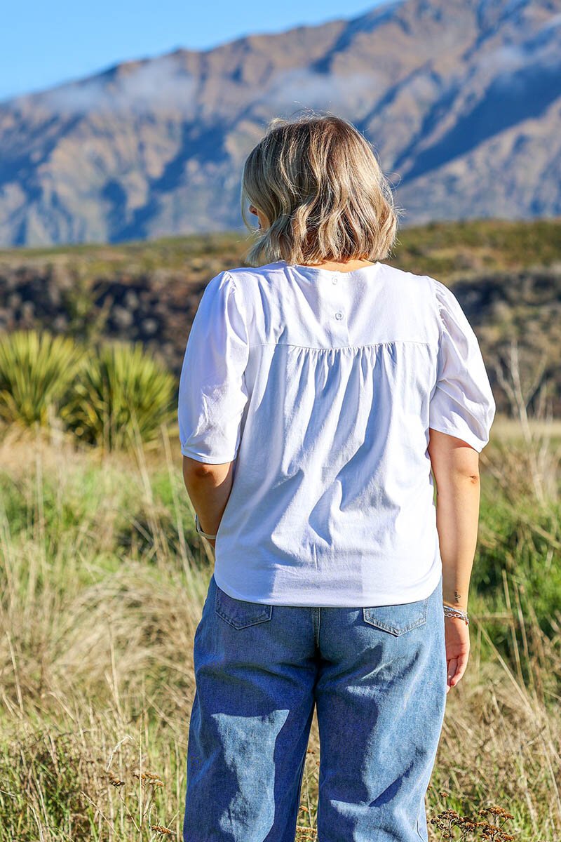 The White On Black Button Back Top is that sweet spot between classic and modern. With softly gathered puff sleeves and a chic button detail at the back, it’s an easy way to add polish to your everyday denim or elevate your work look.
