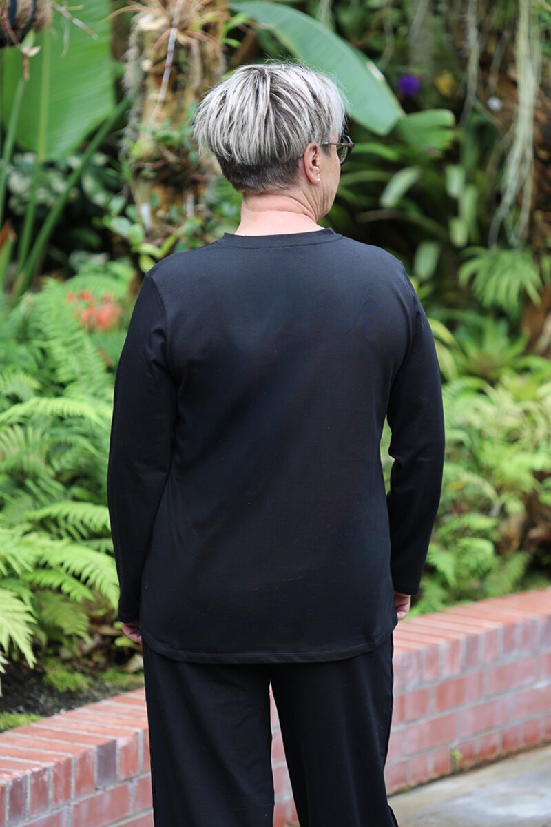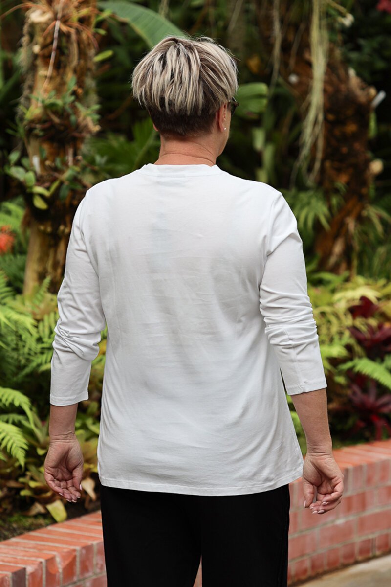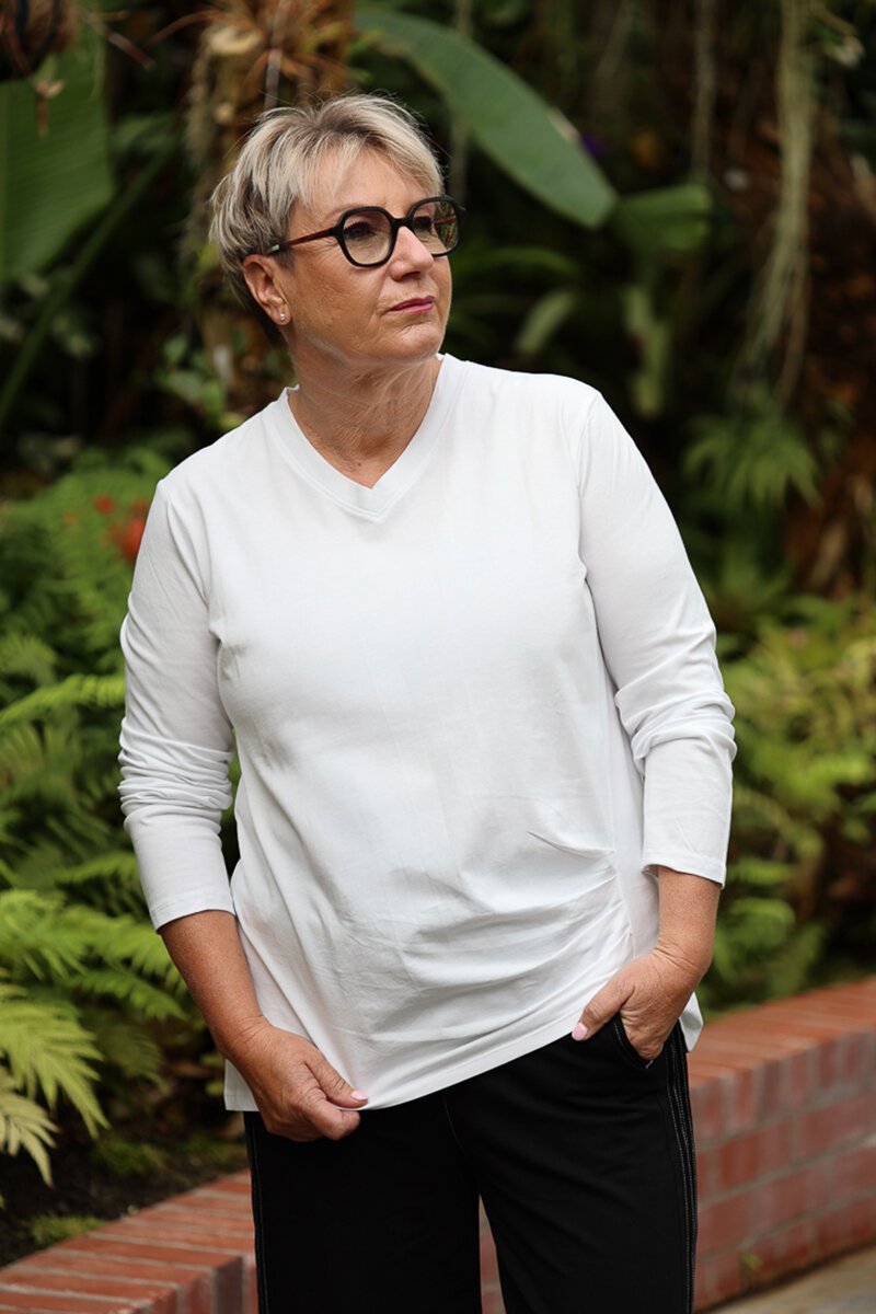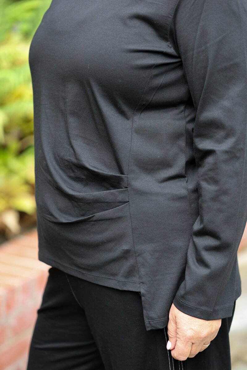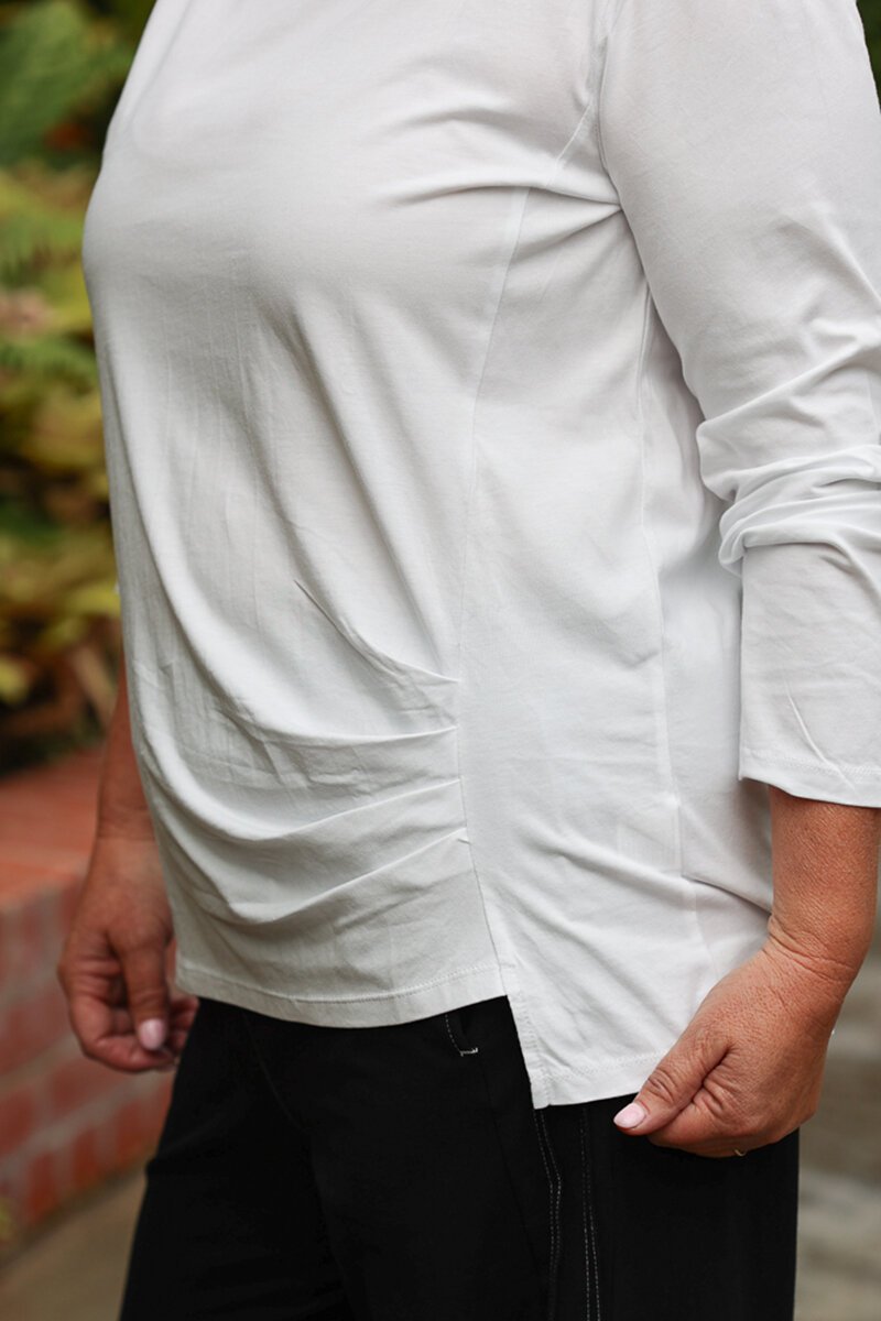 A flattering everyday top with subtle shaping. The White on Black V Rouche Side Top features a soft V neckline and gentle side ruching that creates shape while keeping the fit comfortable and easy to wear.