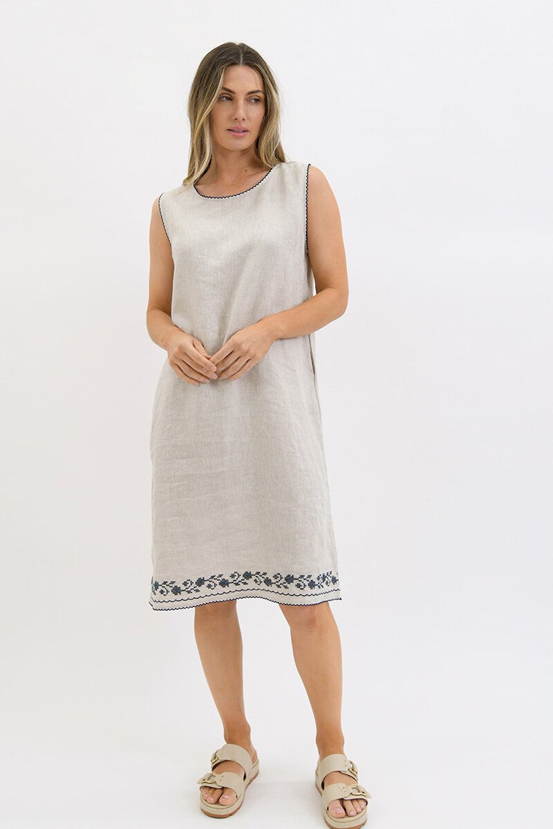 The Worthier Sleeveless Embroidery Hem Dress is understated yet special. Crafted from a linen blend with delicate cross-stitch embroidery along the hem, it’s finished with subtle contrast edging and hidden pockets. A simple throw-on style that still feels put-together.