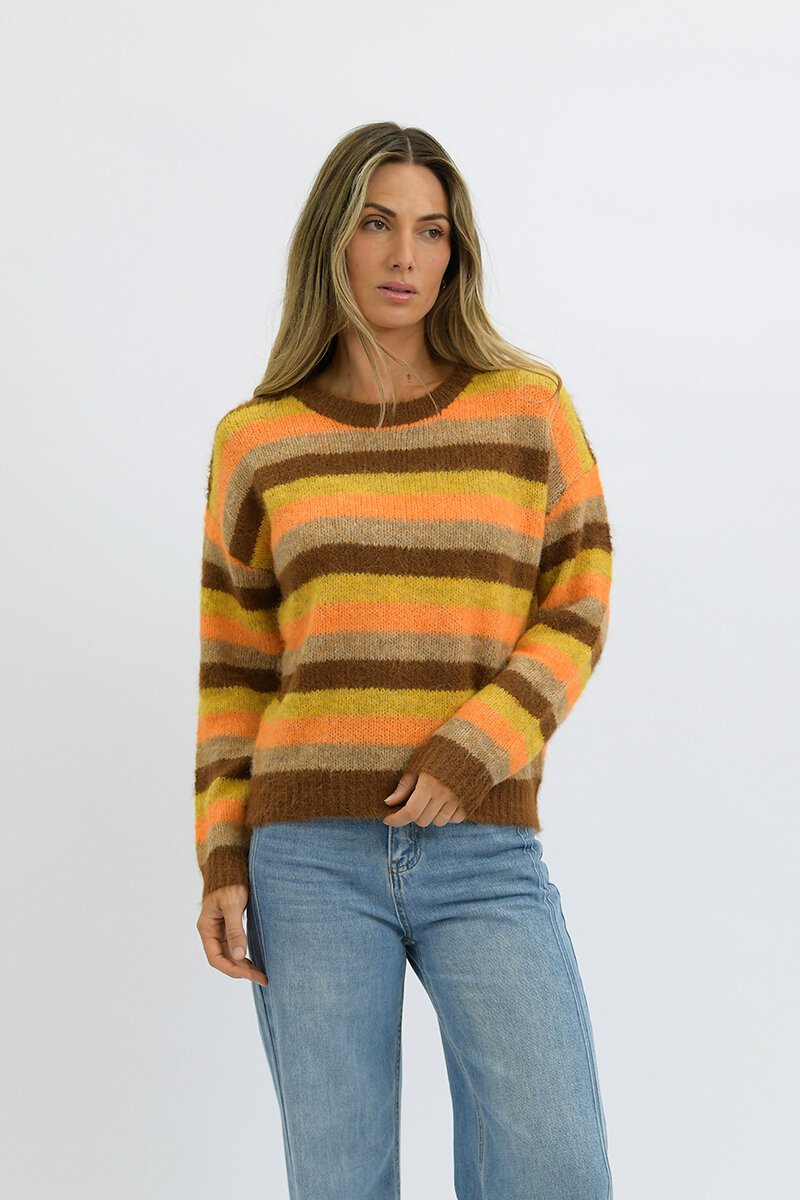The Worthier Tate Multi Tone Stripes Wool Blend Knit is that cosy statement piece your winter wardrobe needs—warm tones, soft texture, and an easy throw-on feel that still looks styled. Just add denim and go.