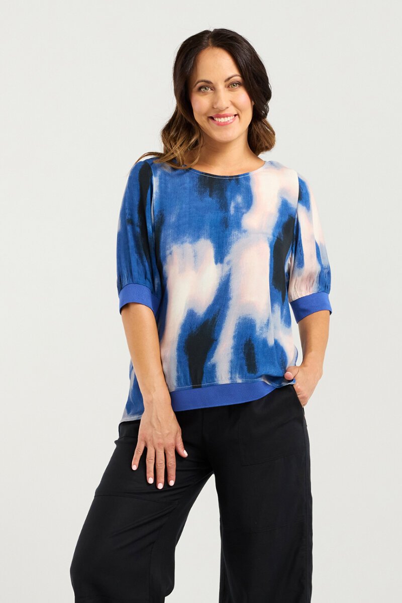 The Zafina Celeste Havana Top is soft and pretty with its mottled blue and pink design. In a relaxed silhouette with feminine touches, it’s an easy blouse to dress up or down—perfect for pairing with denim, linen, or skirts.