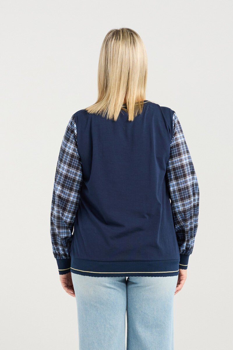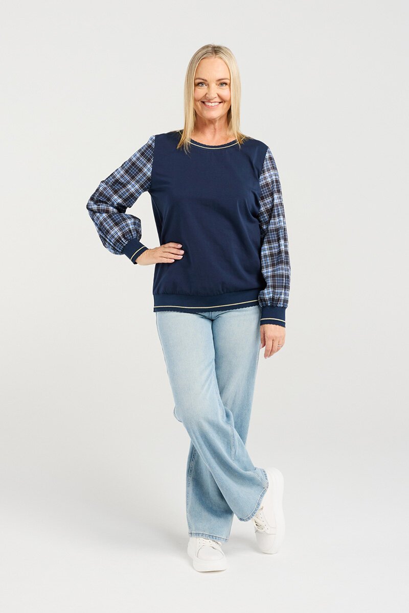 The Zafina Isadora Plaid Night Top is a polished everyday style with a smooth body and contrast plaid sleeves for a modern twist. Subtle trim details add a refined finish, making it an easy piece to dress up or wear casually.